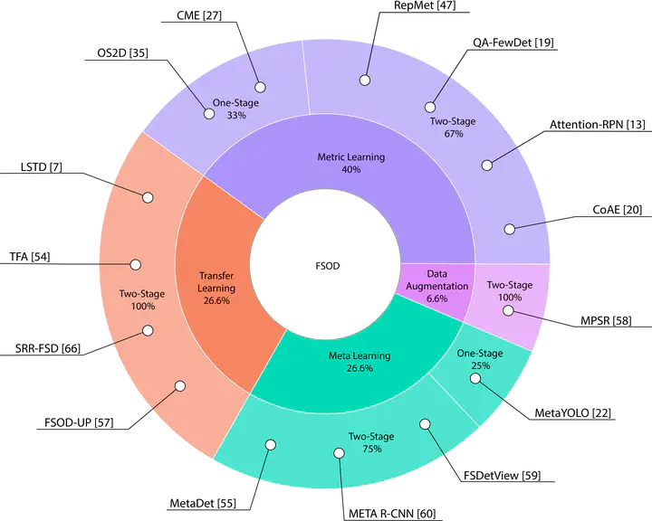 Deep learning approaches have recently raised the bar in many fields, from Natural Language Processing to Computer Vision, by leveraging large amounts of data. However, they could fail when the retrieved information is not enough to fit the vast number of parameters, frequently resulting in overfitting and therefore in poor generalizability. Few-Shot Learning aims at designing models that can effectively operate in a scarce data regime, yielding learning strategies that only need few supervised examples to be trained. These procedures are of both practical and theoretical importance, as they are crucial for many real-life scenarios in which data is either costly or even impossible to retrieve. Moreover, they bridge the distance between current data-hungry models and human-like generalization capability. Computer vision offers various tasks that can be few-shot inherent, such as person re-identification. This survey, which to the best of our knowledge is the first tackling this problem, is focused on Few-Shot Object Detection, which has received far less attention compared to Few-Shot Classification due to the intrinsic challenge level. In this regard, this review presents an extensive description of the approaches that have been tested in the current literature, discussing their pros and cons, and classifying them according to a rigorous taxonomy.